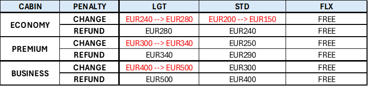 변경 페널티 및 운임이 아래와 같이 변경될 예정입니다.
