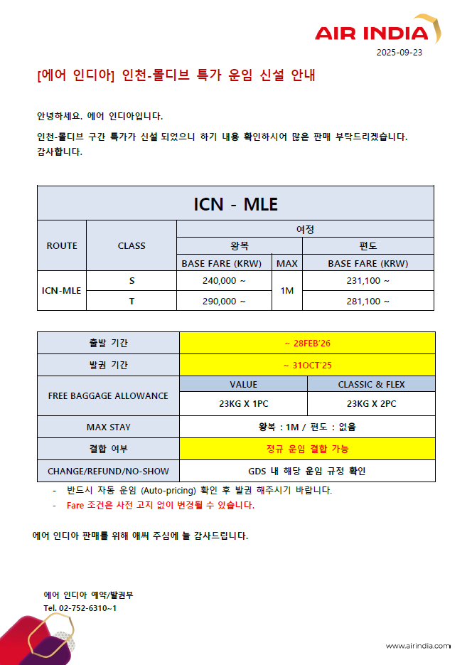 판매가 [에어 인디아] 인천-몰디브 특가 운임 안내