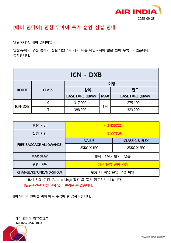 판매가 [에어 인디아] 인천-두바이 특가 운임 안내