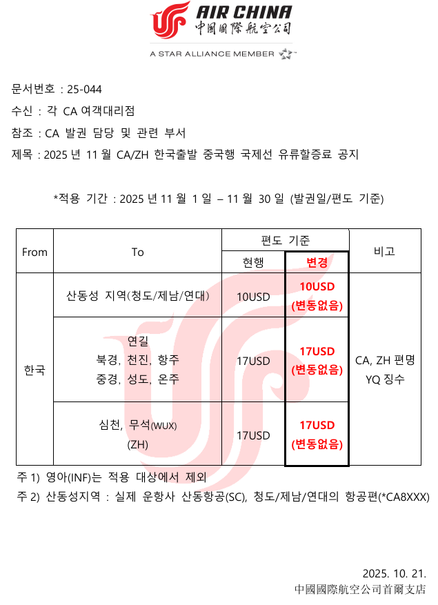 Tax 2025년 11월 CA,ZH 한국출발 중국행 국제선 유류할증료 공지