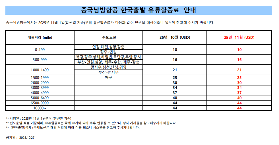 Tax 25년 11월 중국남방항공 유류할증료 안내