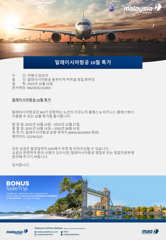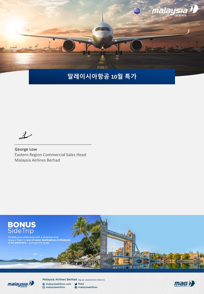 말레이시아항공 10월 특가의 발권일이 연장됩니다.