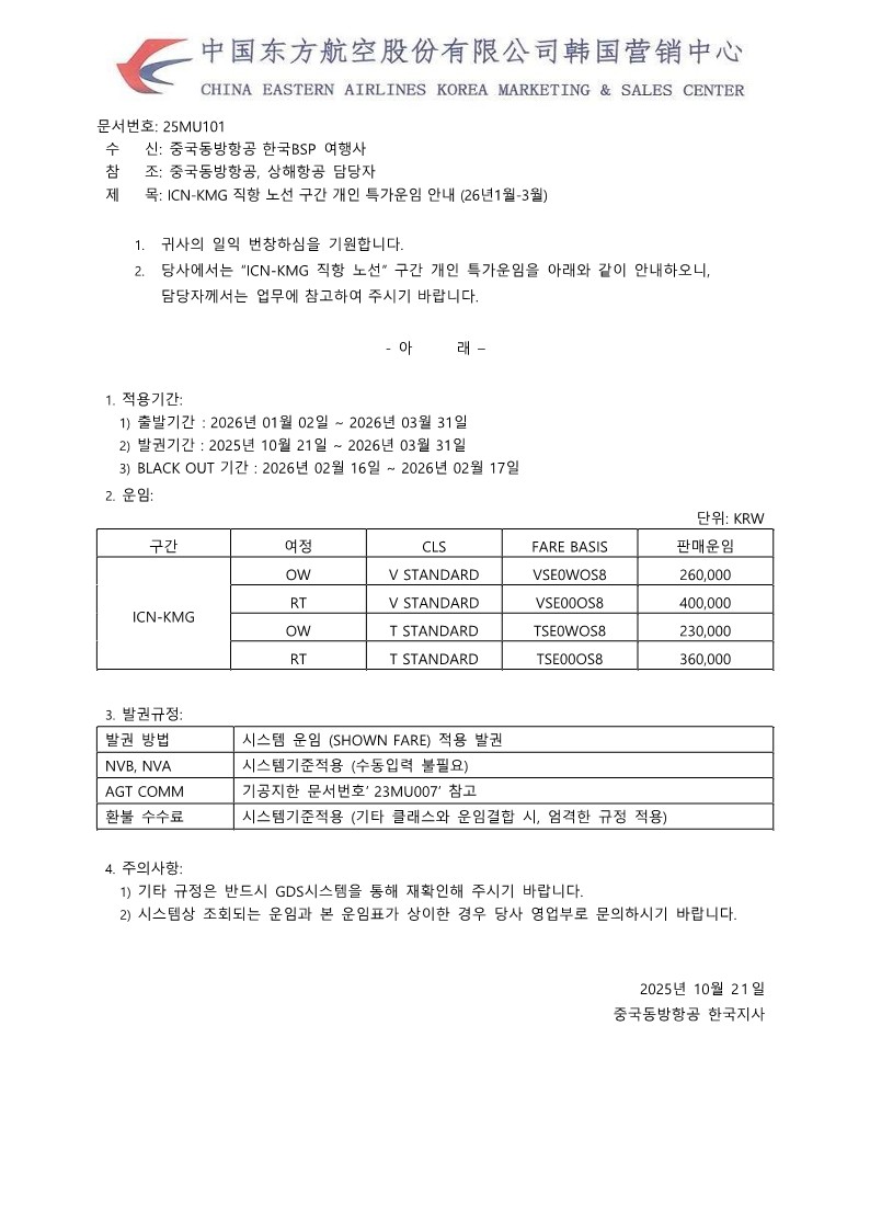 판매가 25MU101_ICN-KMG 직항 노선 구간 개인 특가운임 안내 (26년1월-3월)