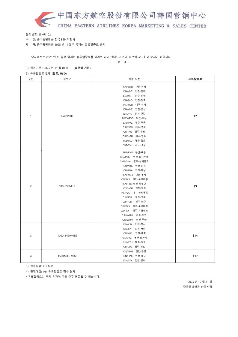 Tax 25MU102_중국동방항공 2025년11월부 국제선 유류할증료 공지