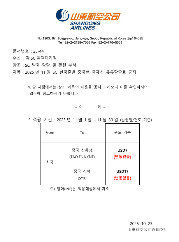 Tax 2025년 11월 SC 한국출발 중국행 국제선 유류할증료 공지