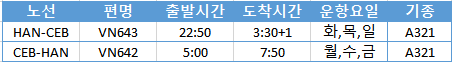 3. 운항요일 : HAN-CEB 화,목,일 / CEB-HAN 월,수,금 (각 주 3회)