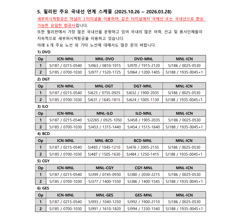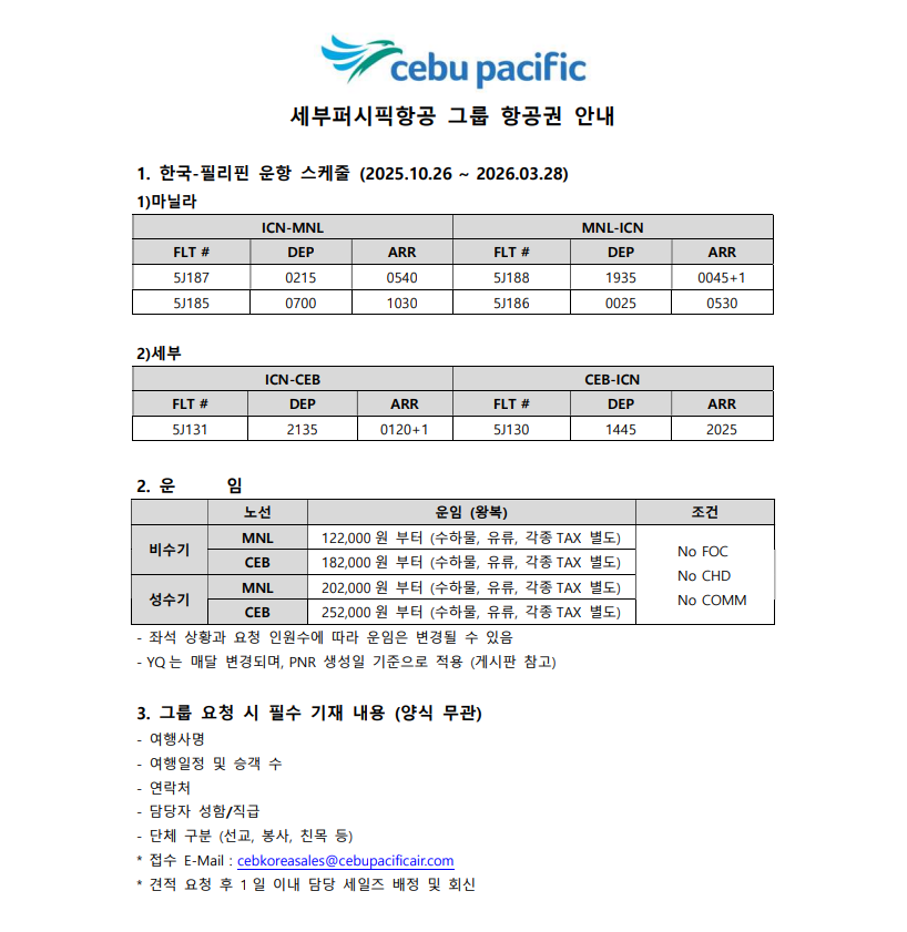 공지사항 [그룹 항공권] 세부퍼시픽항공 그룹 항공권 안내 (2025.10.26 ~ 2026.03.28)