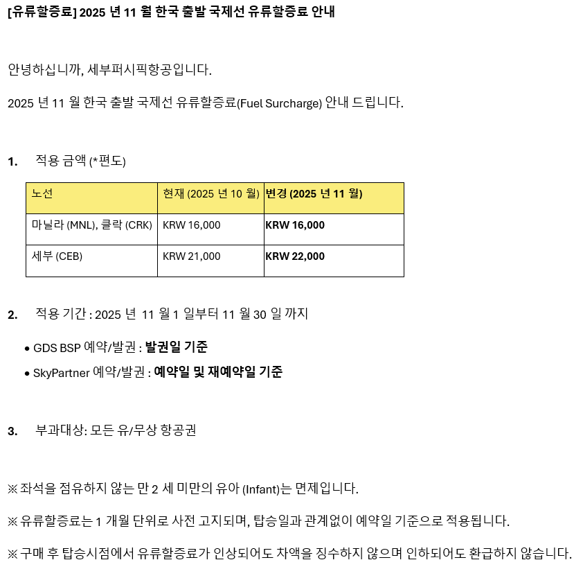 공지사항 [유류할증료] 2025년 11월 한국 출발 국제선 유류할증료 안내