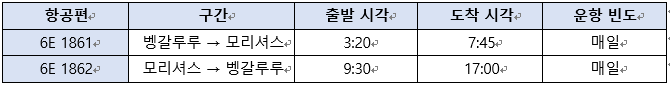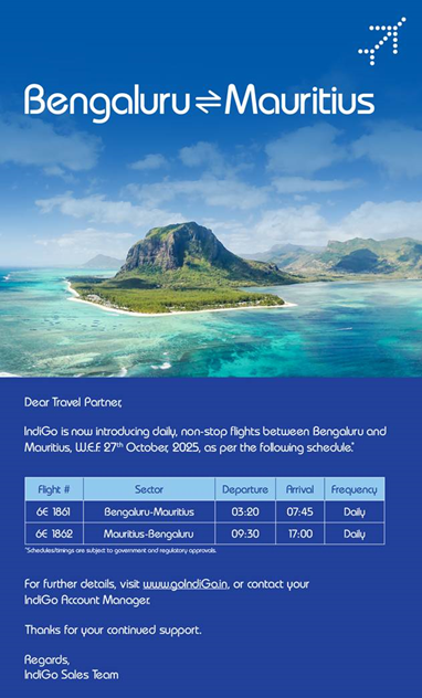 인디고항공은 2025년 10월 27일부터 인도 벵갈루루(BLR) ↔ 모리셔스(MRU) 구간에 대해 매일 직항 노선을 신규 취항합니다.