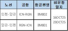 당사에서는 2025년 10월16일, 10월 23일 8M802/8M801편이 비운항됨을 안내드리오니 이용에 참고 부탁드립니다.
