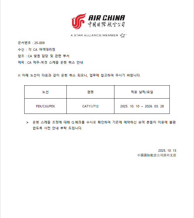 스케줄/운항 CA 제주-북경 스케줄 운항 취소 안내