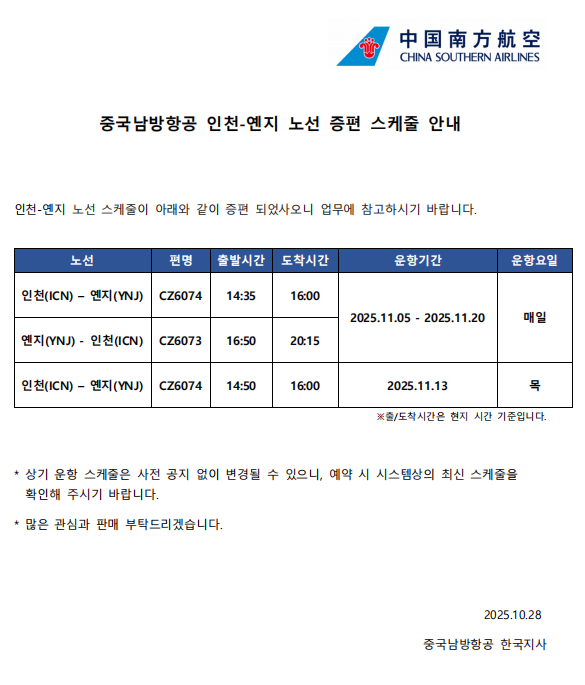 스케줄/운항 중국남방항공 인천-옌지 노선 증편 스케줄 안내