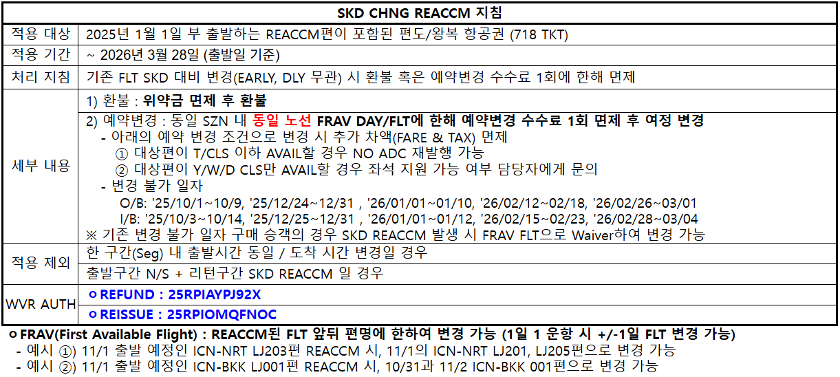 환불/변경 필요시, 아래의 국제선 REACCM PNLTY WVR AUTH 사용하여 처리 요청드립니다.