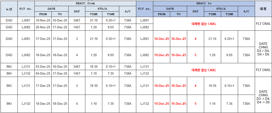 1. 대상 편명 ㅇ LJ1081/2 ICN/DAD v.v. ㅇ LJ131/2 ICN/BKI v.v.