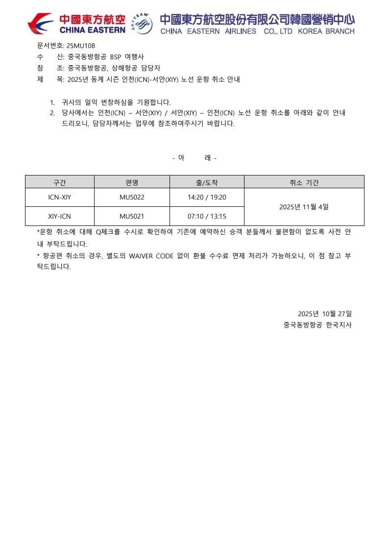 스케줄/운항 25MU108_2025년 동계 인천(ICN)-서안(XIY) 노선 운항 취소 안내