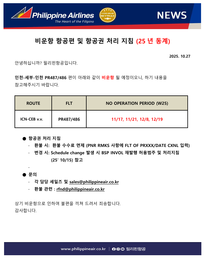 공지사항 [필리핀항공] 비운항 항공편 및 항공권 처리 지침 (25년 동계_세부)