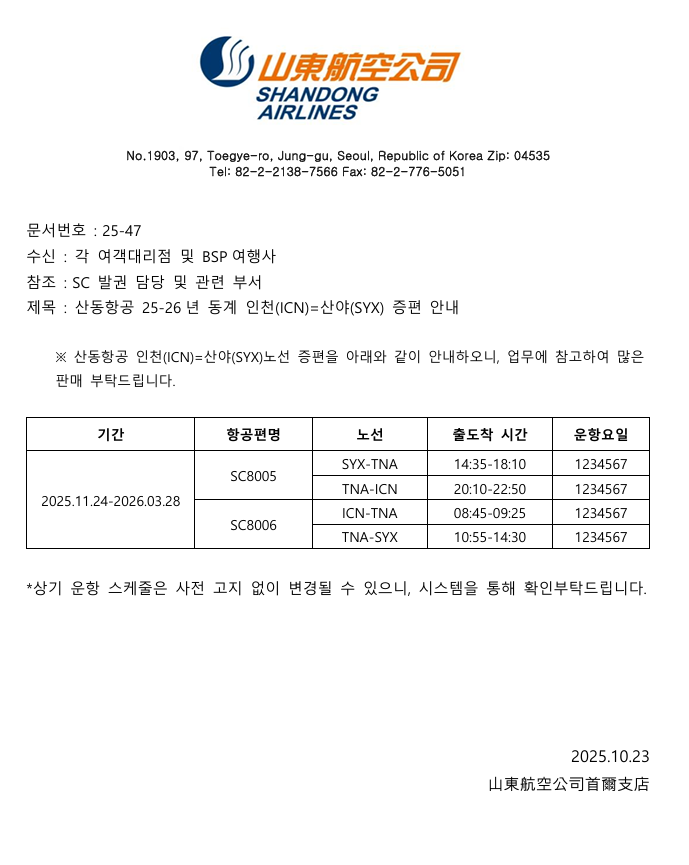 스케줄/운항 산동항공 25-26년 동계 인천(ICN)=산야(SYX) 증편 안내