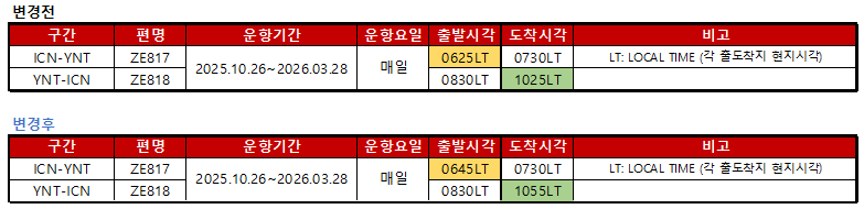 ZE817 / ZE818 편 ICN-YNT v.v 노선 운항 시각이 변경되어 아래와 같이 안내드립니다.