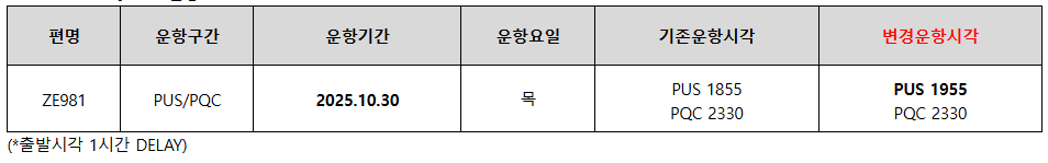 |   안녕하십니까, 이스타항공입니다.     ZE981/30OCT PUS-PQC 노선 운항 시각이 변경되어 아래와 같이 안내드립니다.