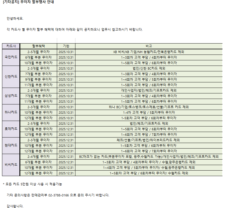 무이자 할부 내역은 아래를 참고하시기 바랍니다.
